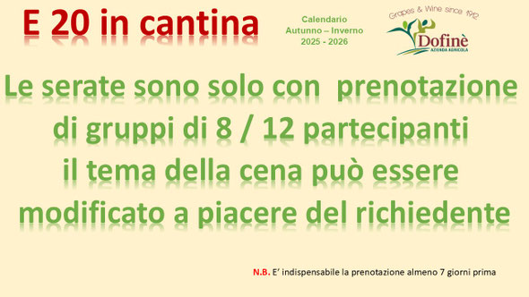 Se sei stanco delle solite serate ti proponiamo una cena diversa, assaporando cibi tipici della nostra tradizione abbinati a vini selezionati, sarai guidato da narrazioni storiche di viticoltura e territorio in un clima familiare.